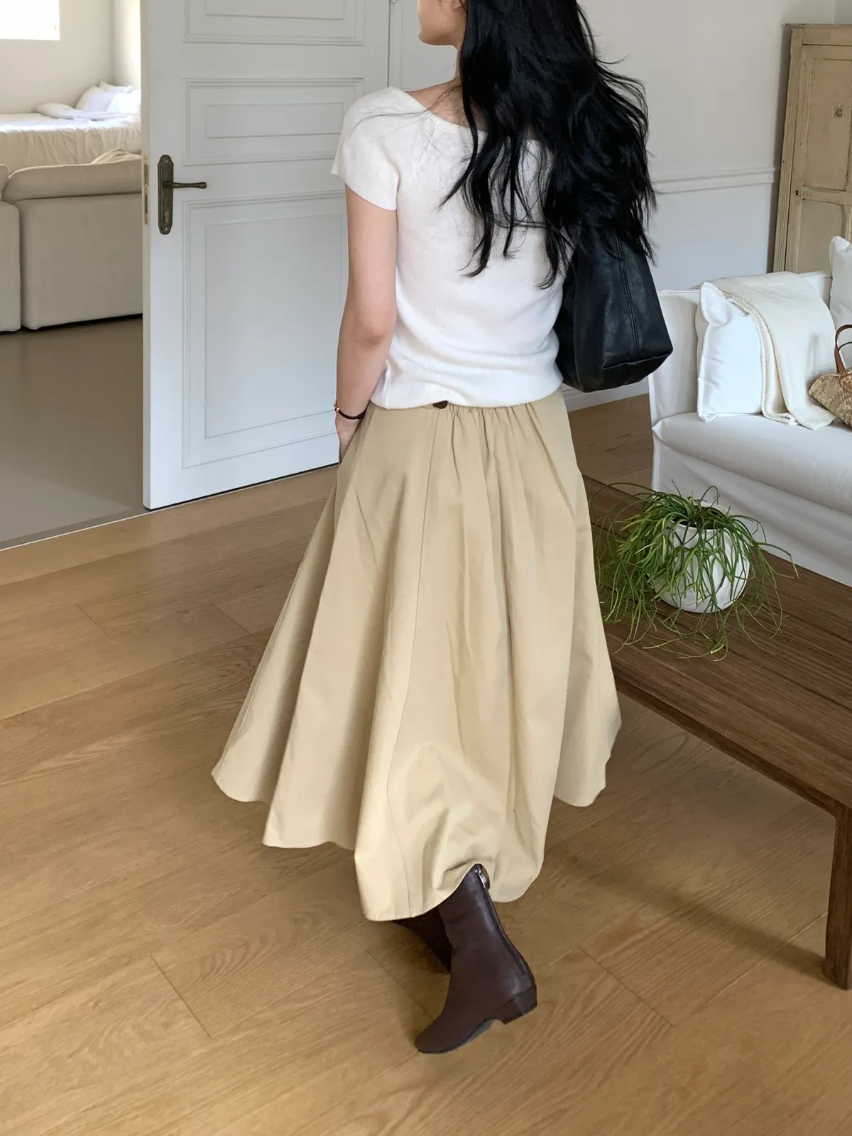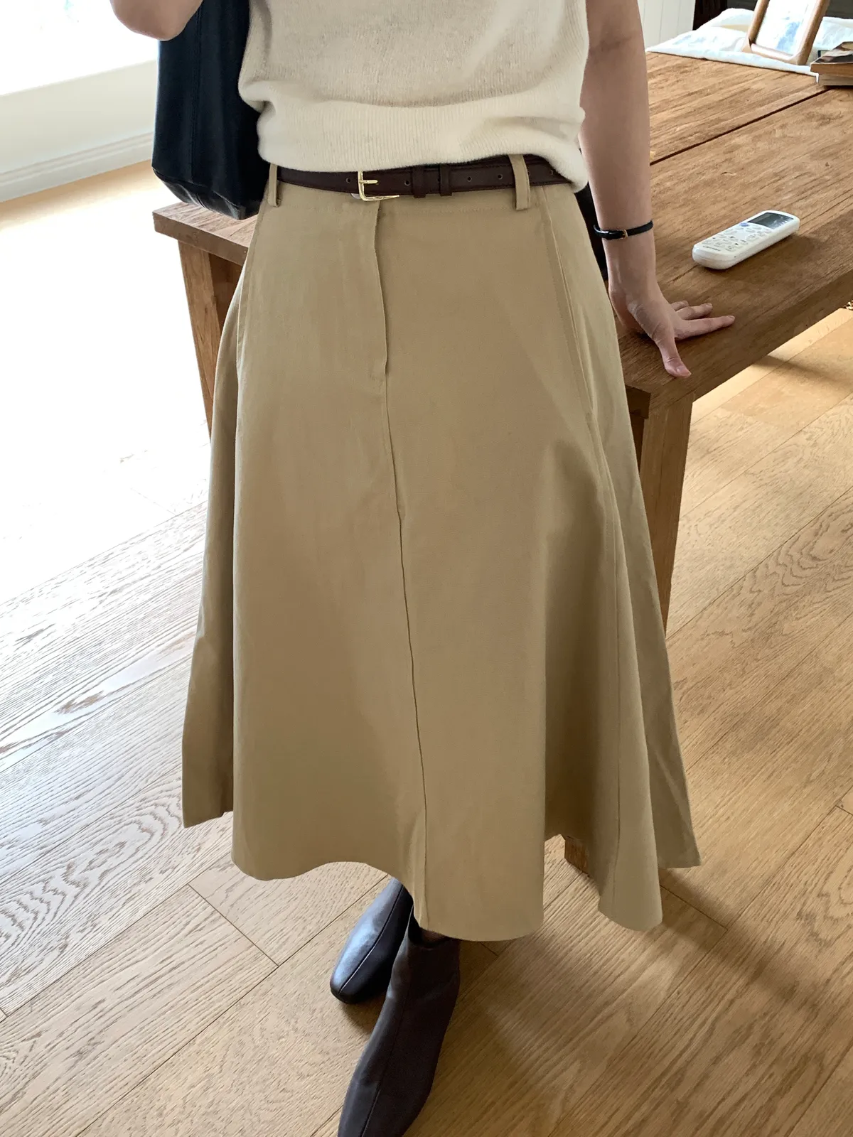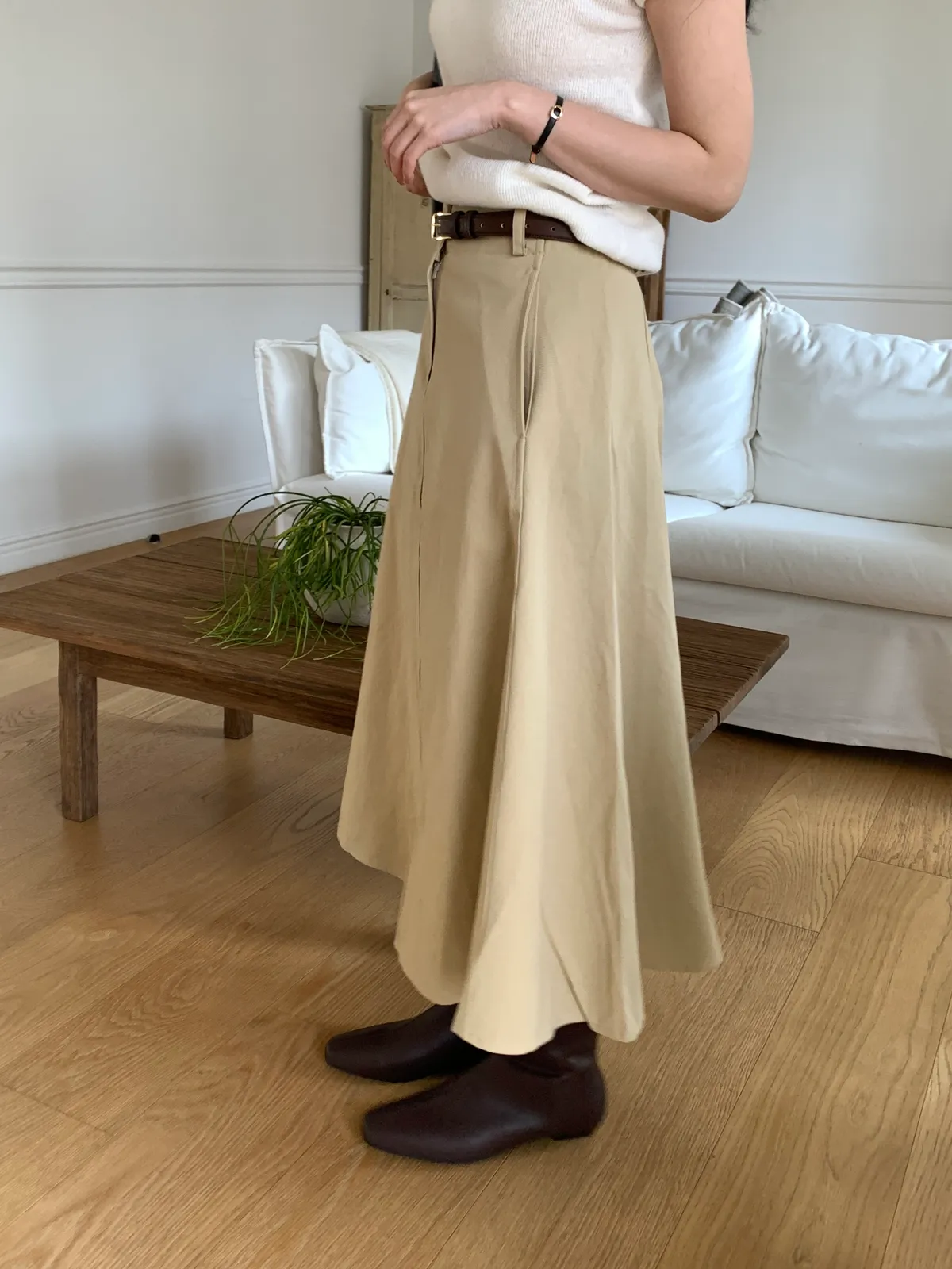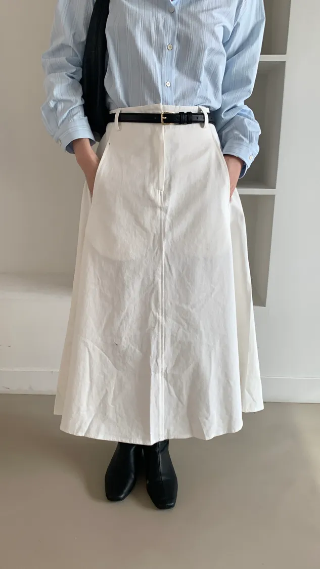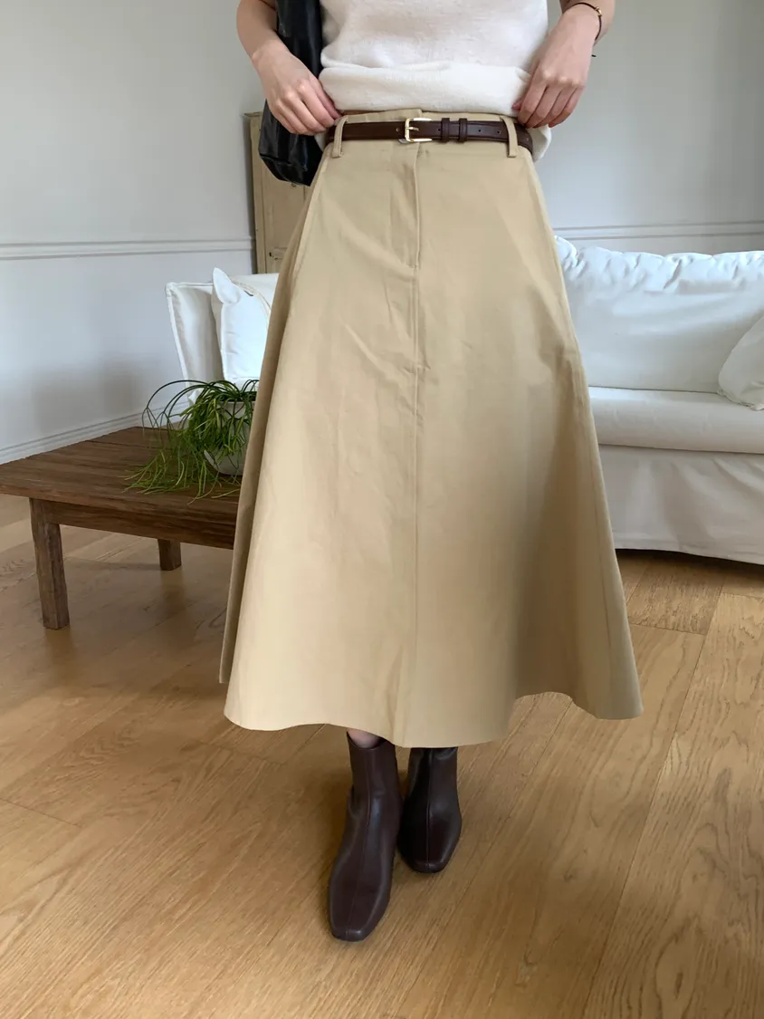 顏色:駝、白 平量尺寸:cm 全長81、腰寬30~38、臀寬57、裙襬寬101 材質:COTTON 100% Model: (官網棚拍模特) 162/44 肩寬39、最細腰圍61、肚臍圍66、臀圍88、大腿圍50