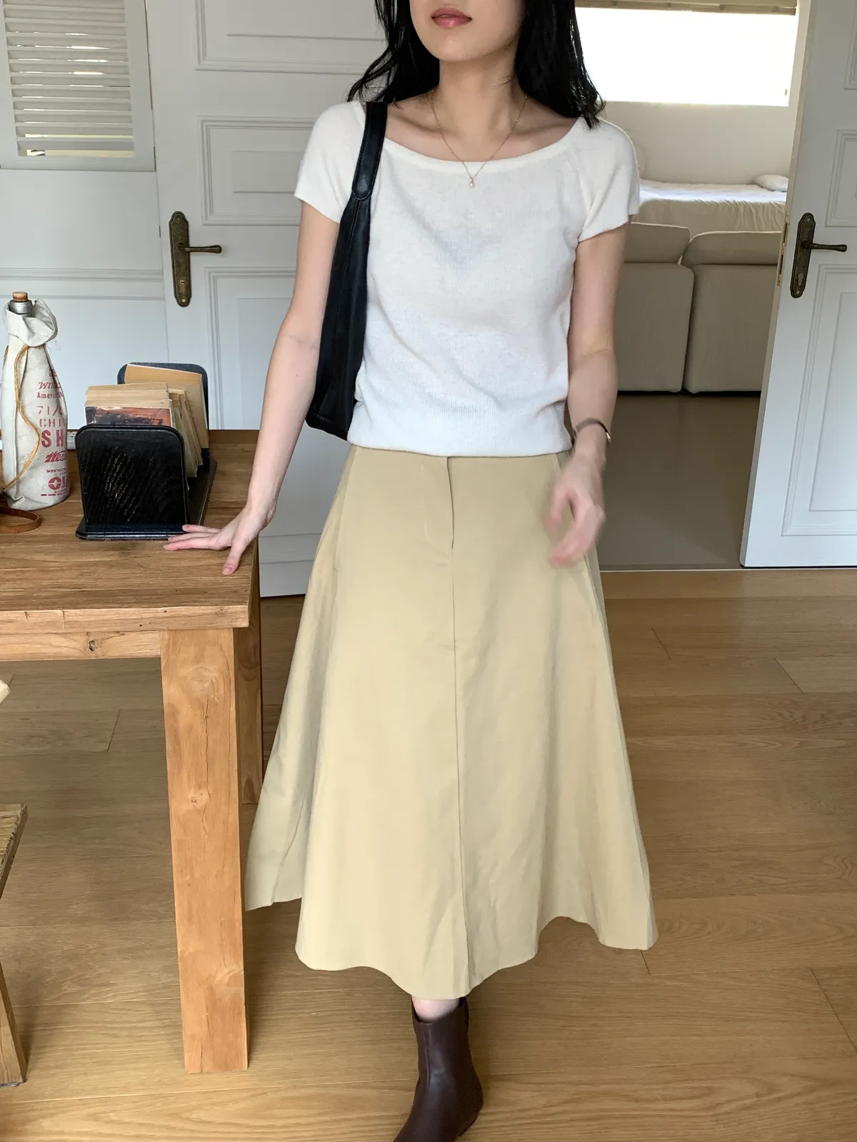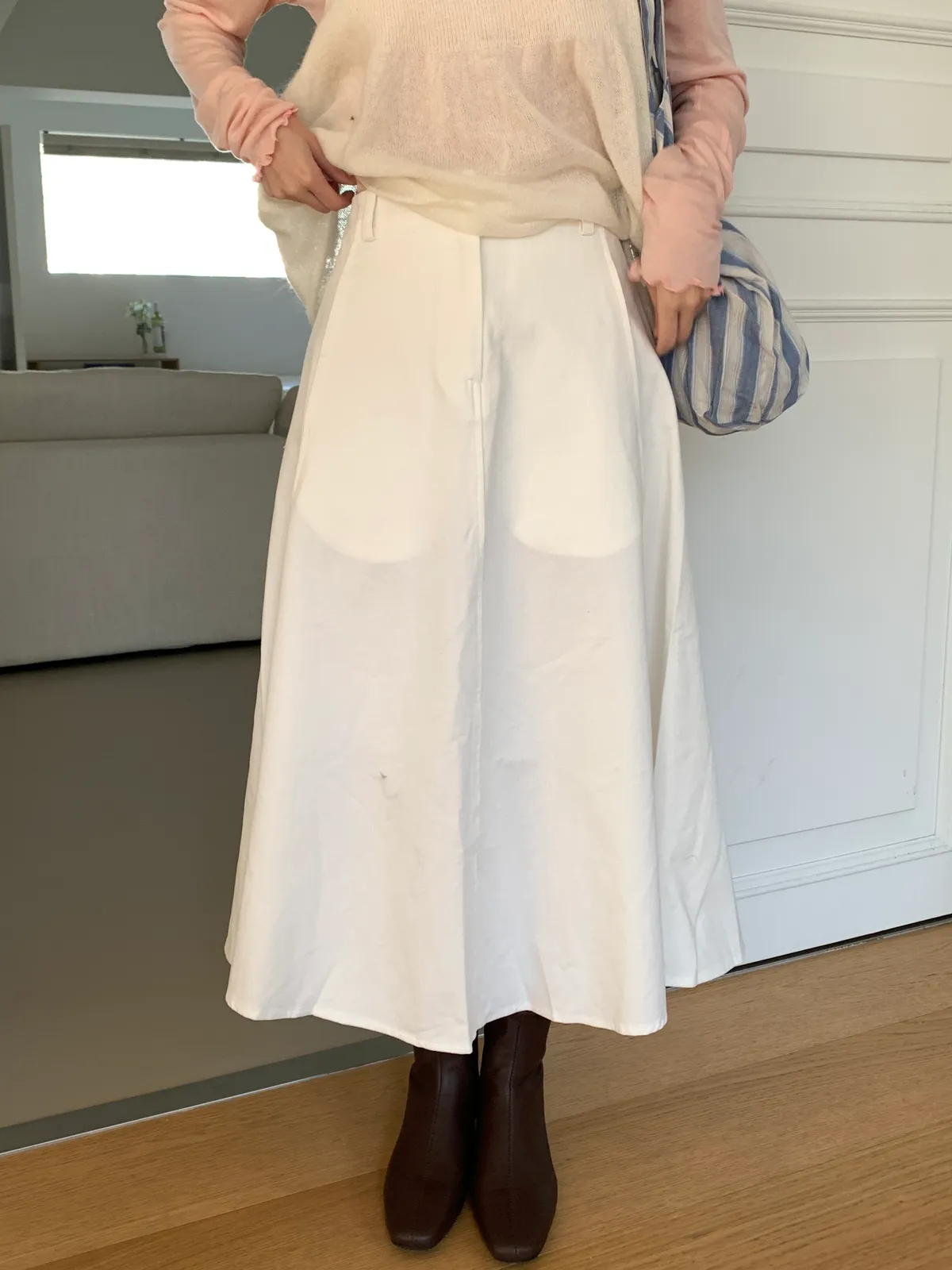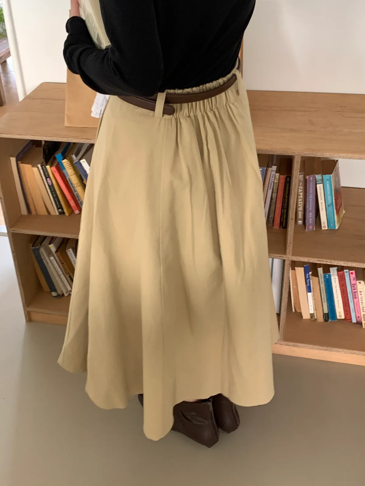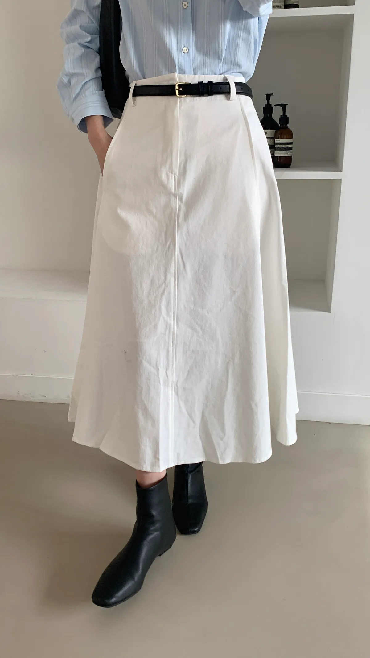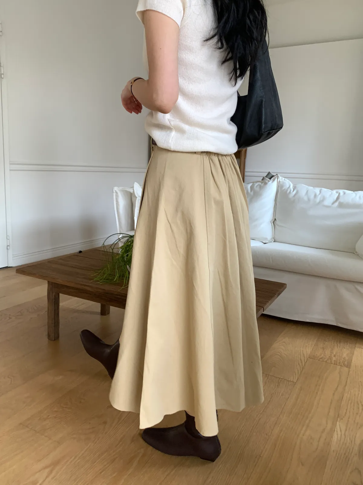 顏色:駝、白 平量尺寸:cm 全長81、腰寬30~38、臀寬57、裙襬寬101 材質:COTTON 100% Model: (官網棚拍模特) 162/44 肩寬39、最細腰圍61、肚臍圍66、臀圍88、大腿圍50