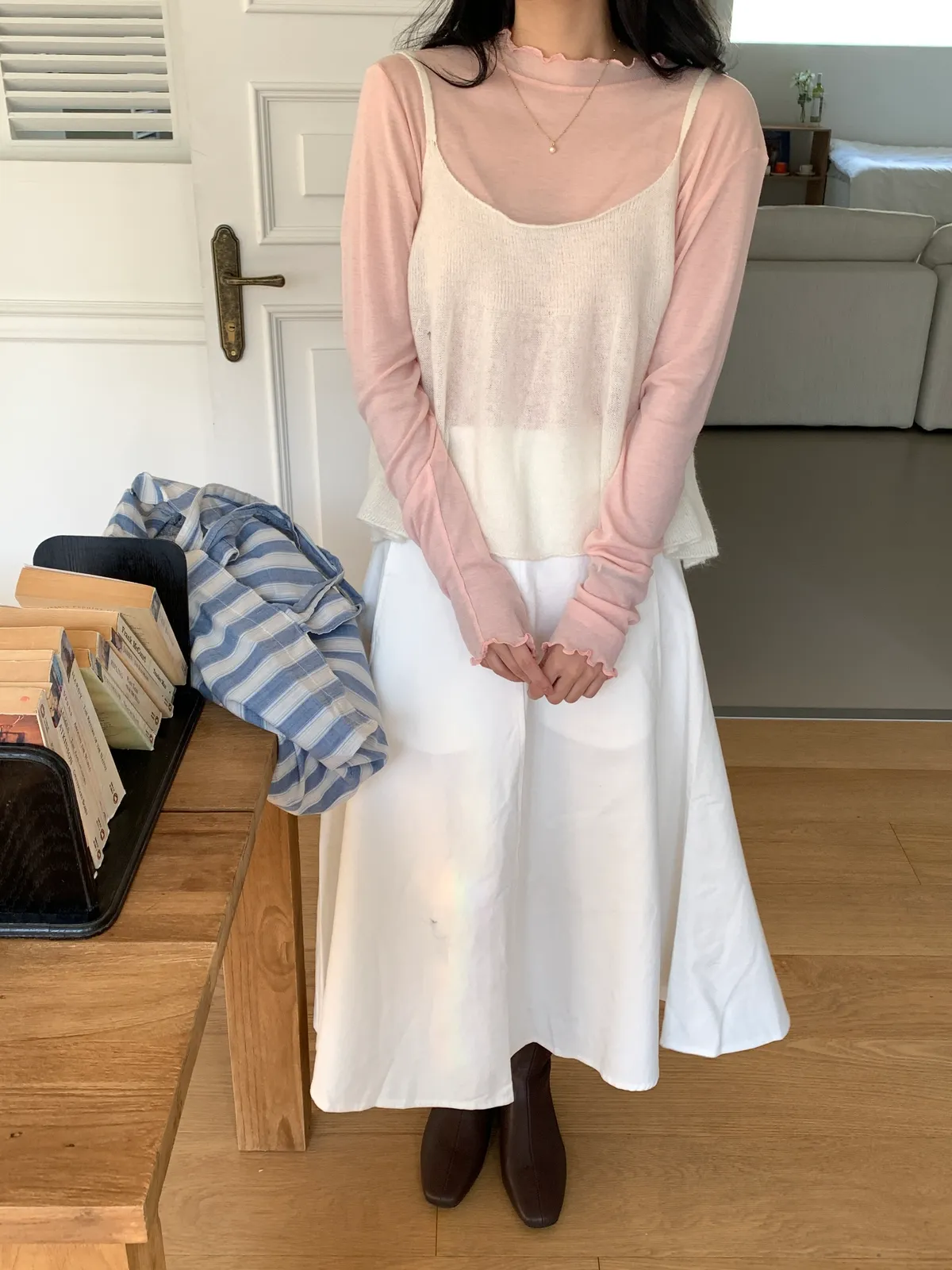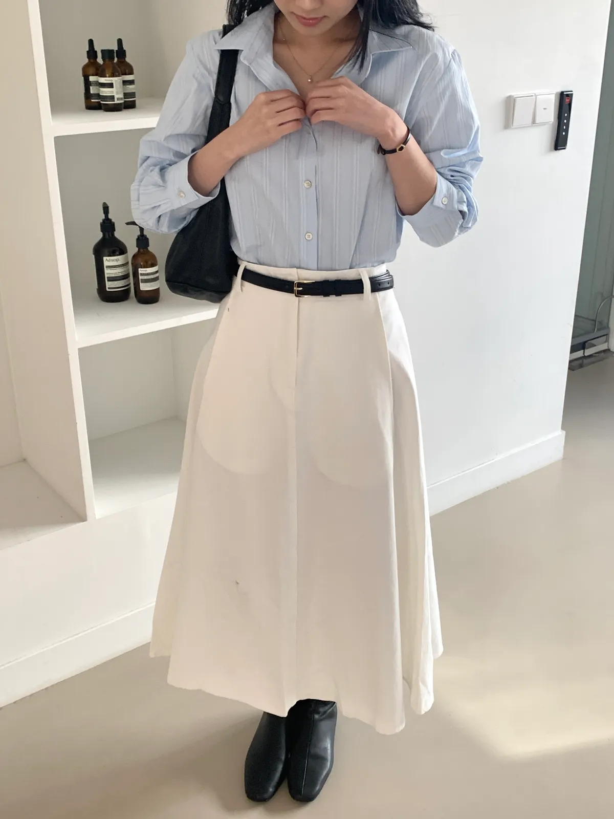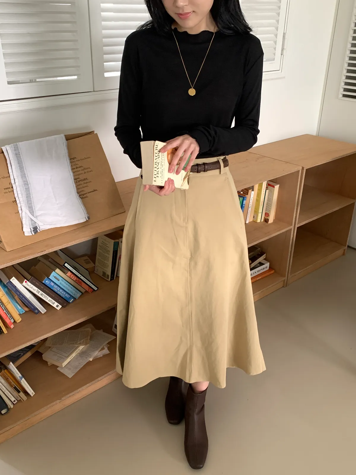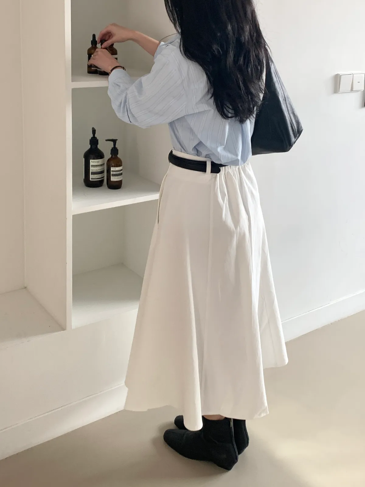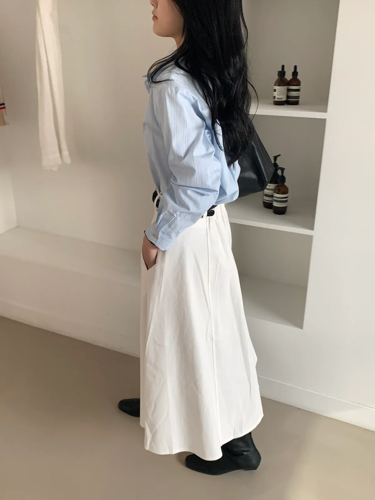 顏色:駝、白 平量尺寸:cm 全長81、腰寬30~38、臀寬57、裙襬寬101 材質:COTTON 100% Model: (官網棚拍模特) 162/44 肩寬39、最細腰圍61、肚臍圍66、臀圍88、大腿圍50